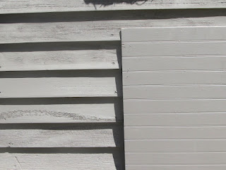 Sixteen foot doors are sanded, cleaned, primed, painted. We couldn't get an overlay design of any kind because of the dark color which would warp them. So flush it is, and I ordered bean straps for them. Rather than drill into the steel (I hate steel doors) we will use strong magnets to hold the decorative straps. Our old door had very pronounced wood grain texture, this does not. If we would have chosen windows or patterned styles I can't imagine the headache with priming and painting. So I'm glad it's simple.